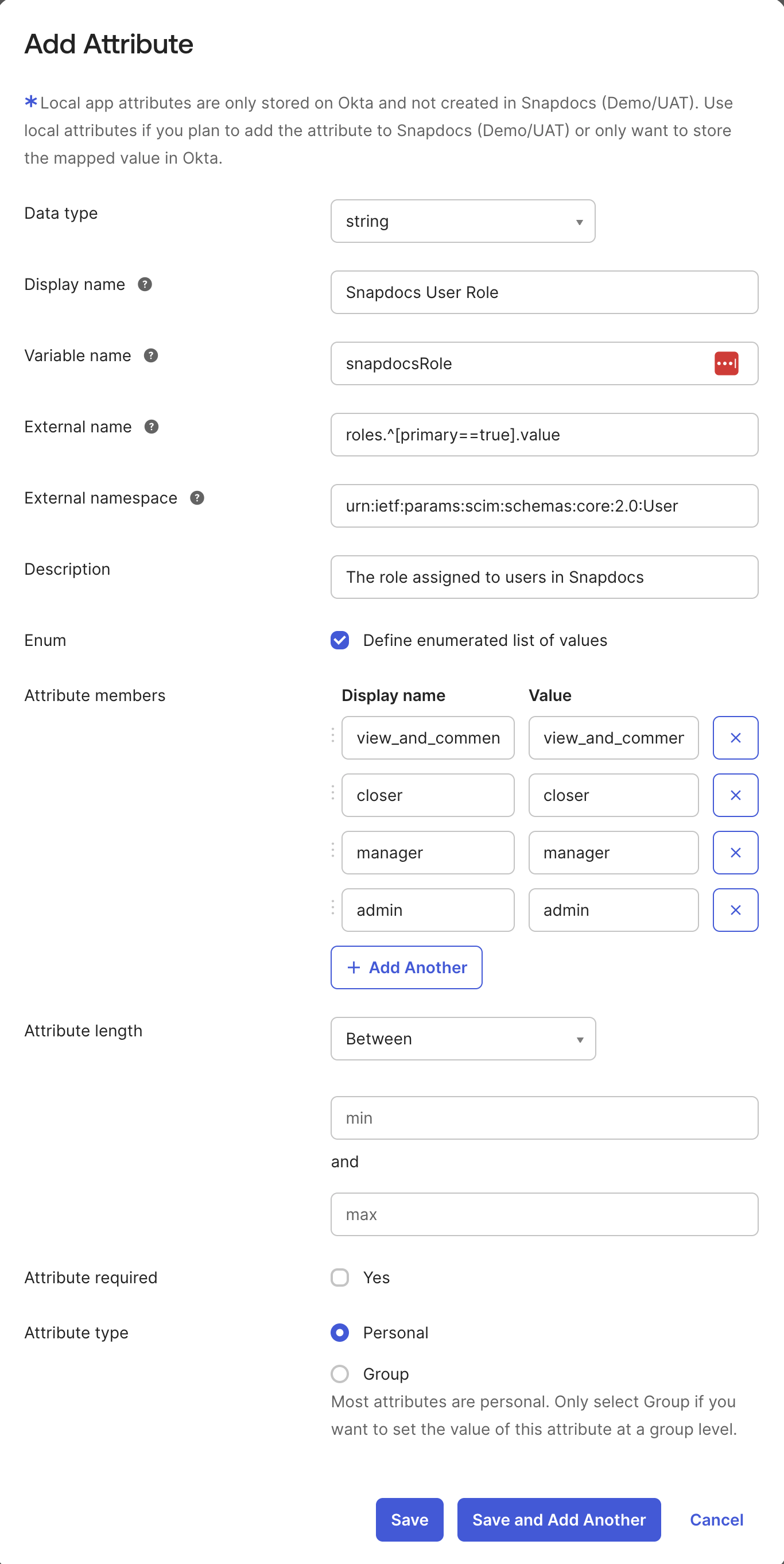 Note on roles for EntraIn Entra, the role can be set by defining app roles in your Snapdocs Entra application. Define four roles, each with a value matching a role name in the above table. Assign users (directly or via groups) to these app roles, and add a SCIM attribute mapping for the target attribute